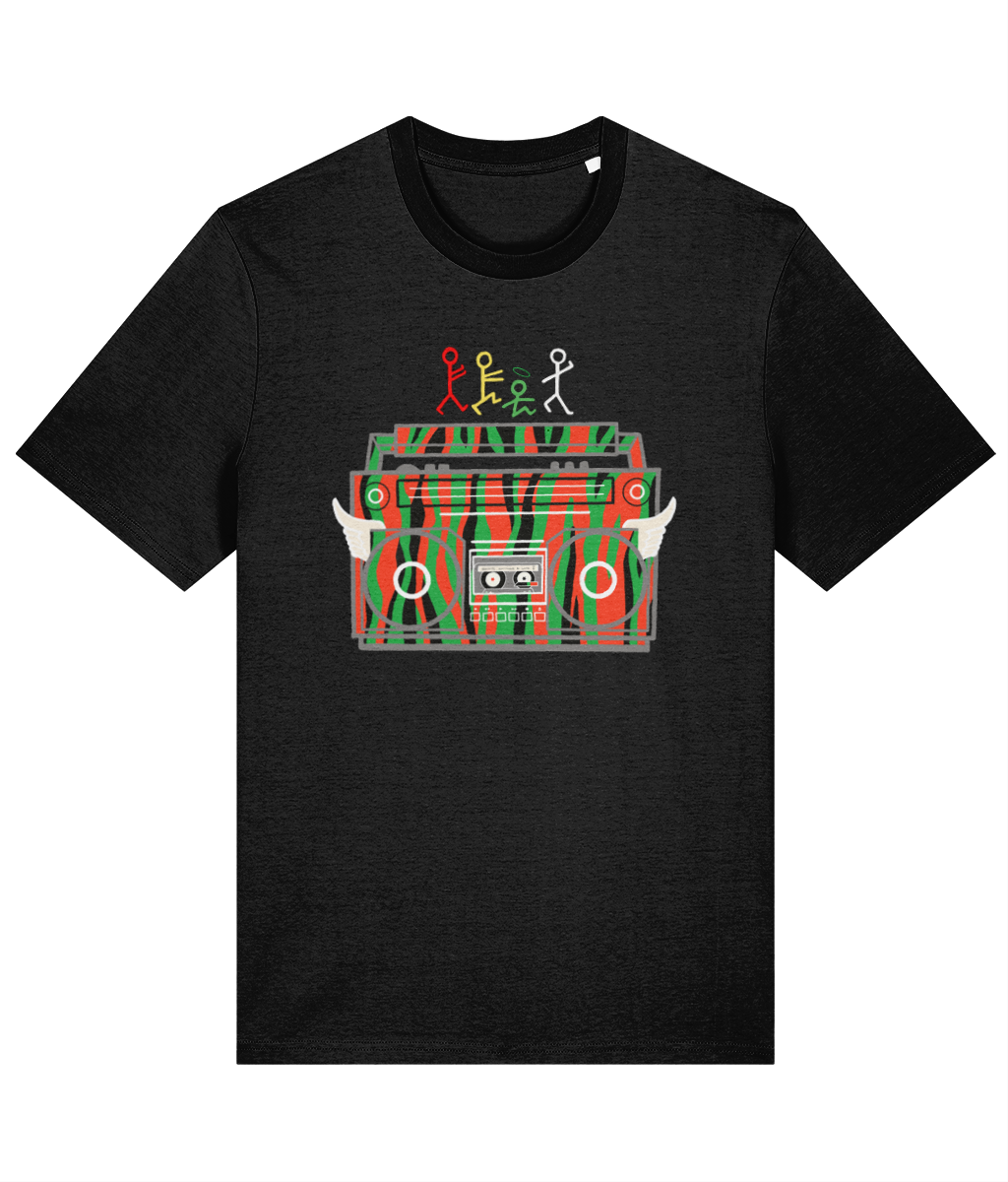 "To all the people who can Quest like A Tribe does..." A tribute to our favourite rap group of all time, this design is a nod to their iconic stick figure logo fused with the idea of a red, black and green winged boombox. Can you kick it? (Yes, you can!)